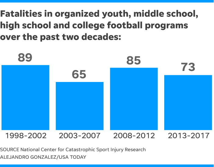 The focus on concussions can obscure the deaths that continue to occur each year. Last year, 13 high school and college players died from incidents that include heat stroke, head injuries and sudden cardiac arrest.